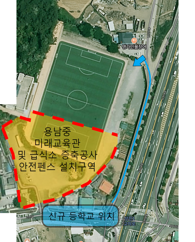 '용남중학교 미래교육관 및 급식소 증축공사’로 인하여 통학로가 아래와 같이 변경되오니 등·하교시 안전에 유의해 주시기 바랍니다.