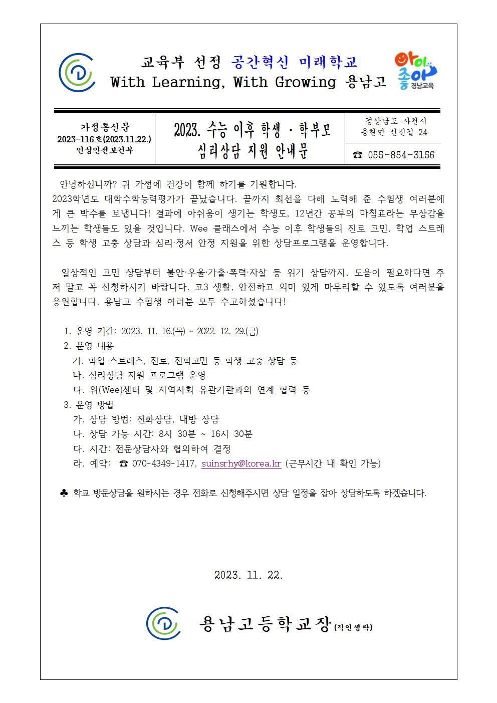 [2023-116호]2023.수능이후 학생 심리상담 지원 안내 가정통신문
