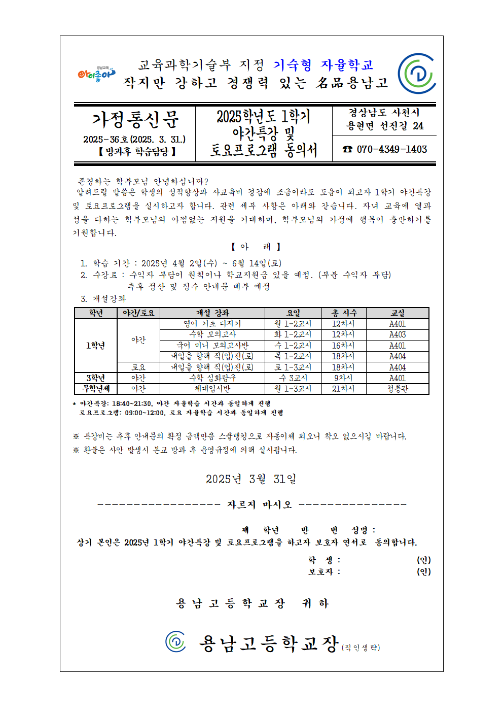 [2025-36호] 2025학년도 1학기 야간특강 및 토요프로그램 동의서 가정통신문