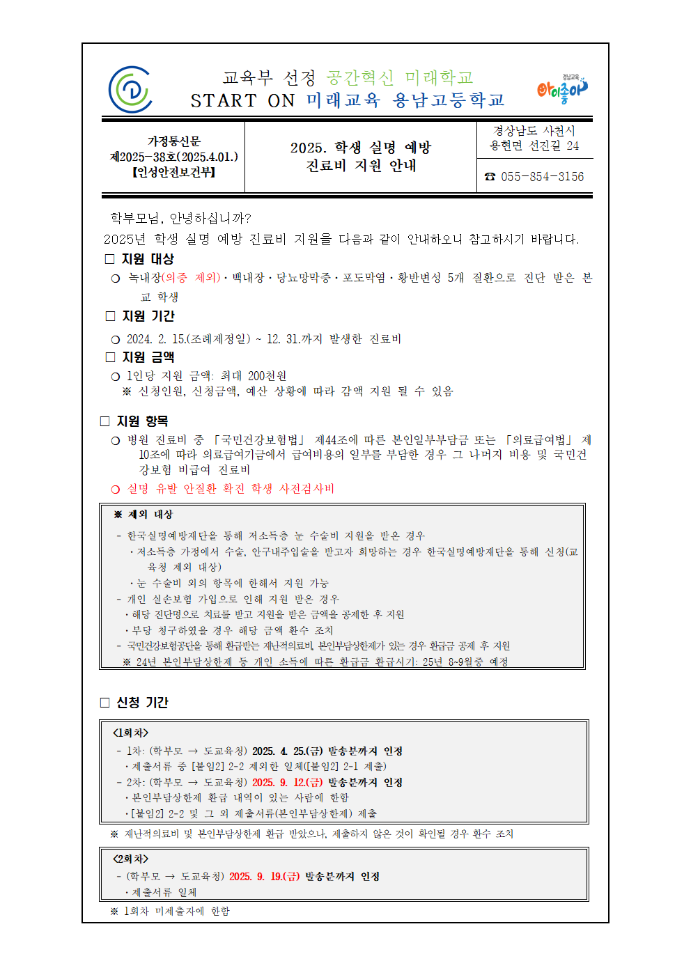2025년 학생 실명 예방 진료비 지원 안내 가정통신문입니다. 첨부파일을 확인해주십시요.