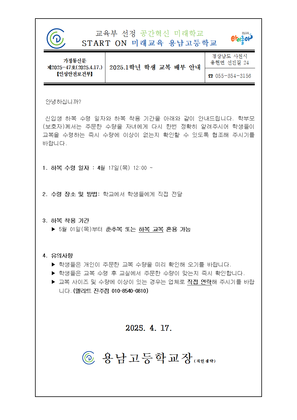 [2025-47호]2025년 1학년 학생 하복 교복 배부 안내 가정통신문