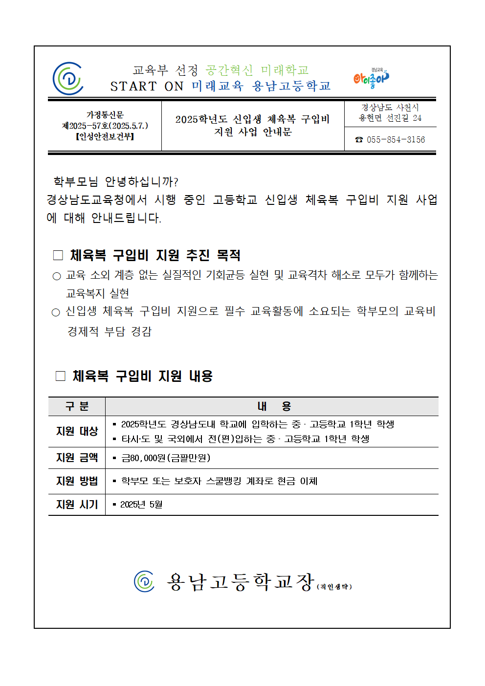 [2025-57호] 2025년 1학년 학생 체육복 구입비 지원 안내
