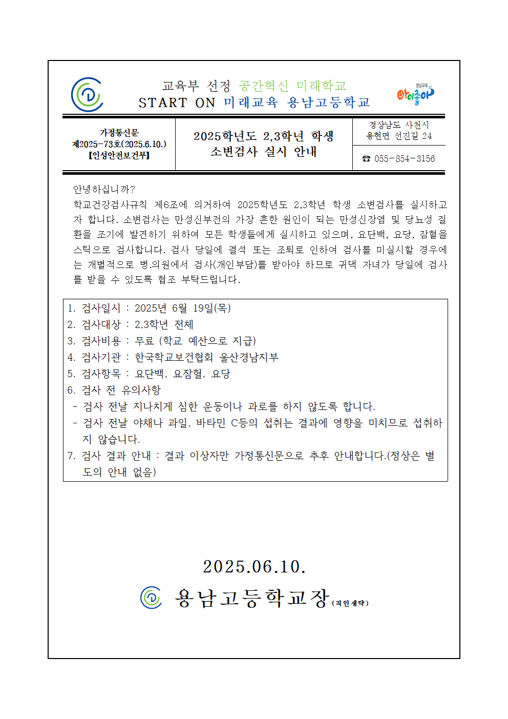 [2025-73호] 2025학년도 2,3학년 학생 소변검사 실시 안내