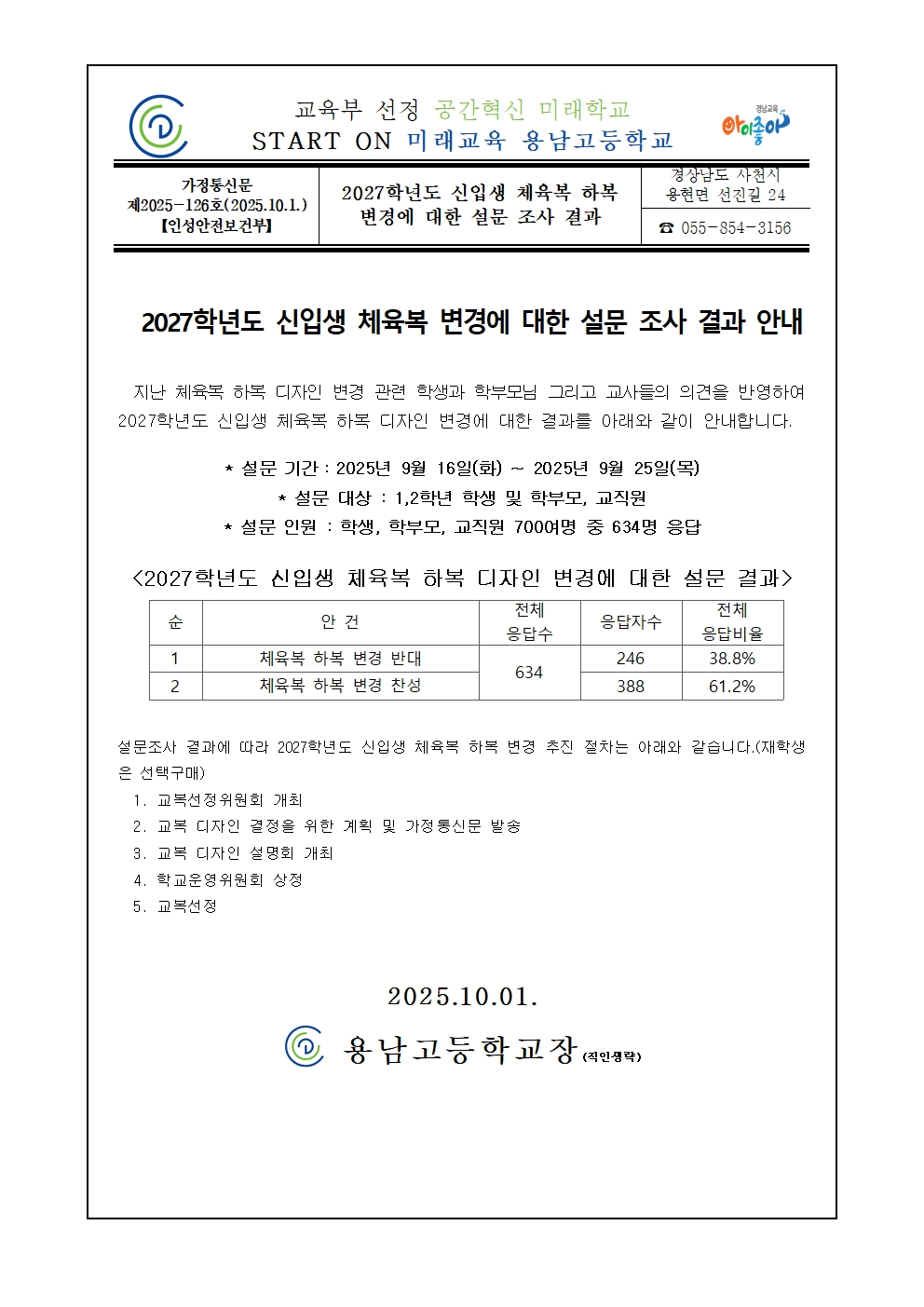 [2025-126호] 2027학년도 신입생 체육복 변경에 대한 설문 조사 결과 안내